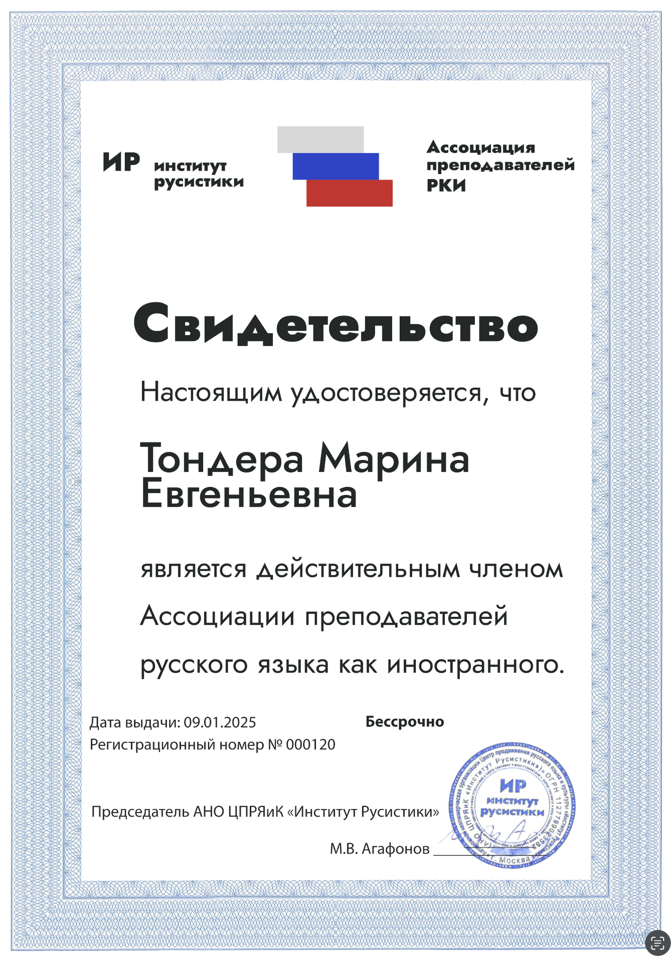 Является действительным членом Ассоциации преподавателей русского языка как иностранного.