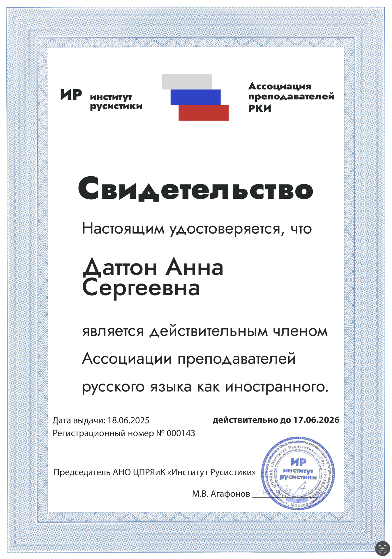 Является действительным членом Ассоциации преподавателей русского языка как иностранного.