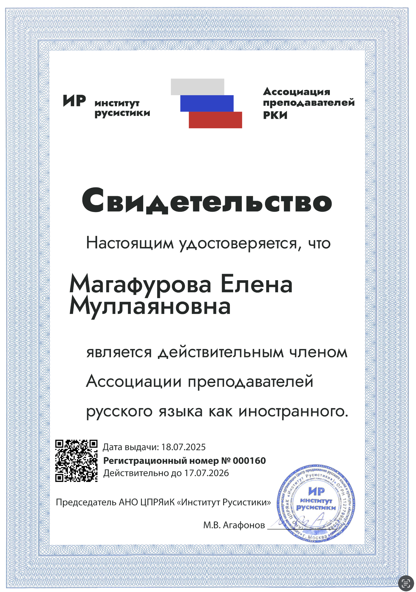 Является действительным членом Ассоциации преподавателей русского языка как иностранного.
