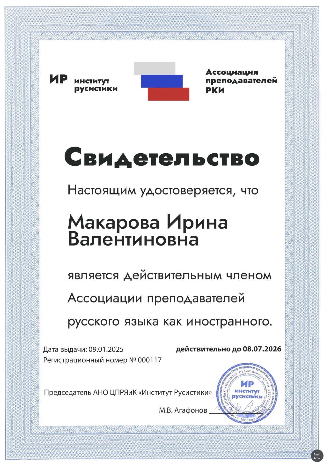 Является действительным членом Ассоциации преподавателей русского языка как иностранного.