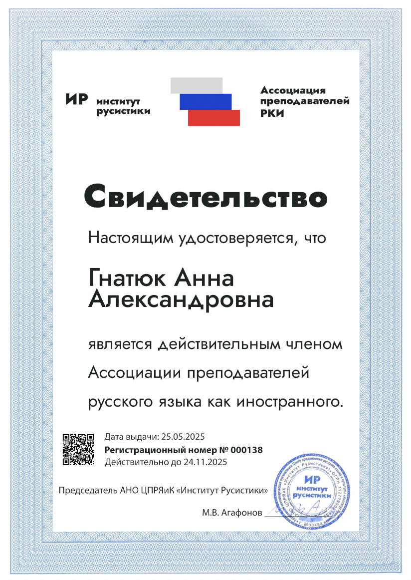 Является действительным членом Ассоциации преподавателей русского языка как иностранного.