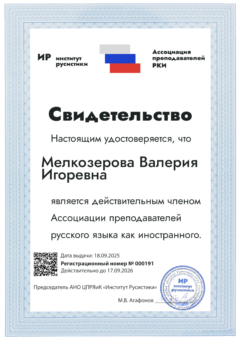 Является действительным членом Ассоциации преподавателей русского языка как иностранного.