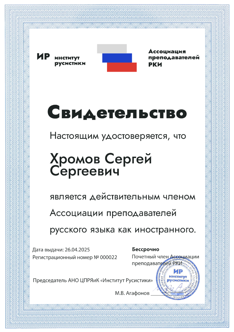 Является действительным членом Ассоциации преподавателей русского языка как иностранного.